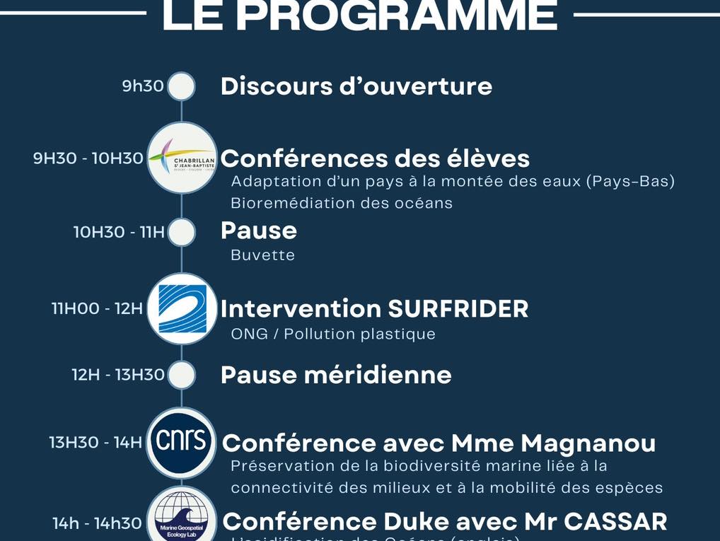 Cette journée, riche en interventions de grande qualité, a permis de sensibiliser les participants aux enjeux environnementaux, géographiques et planétaires liés aux océans. Plusieurs experts reconnus ont répondu présents, parmi lesquels Nicolas Cassar, chercheur à l’Université de Duke, Élodie Magnanou, chercheuse au CNRS, ainsi que des représentants d’organisations engagées pour la protection du milieu marin, telles que Surfrider et Greenpeace. Nous les remercions chaleureusement d’avoir soutenu ce projet.